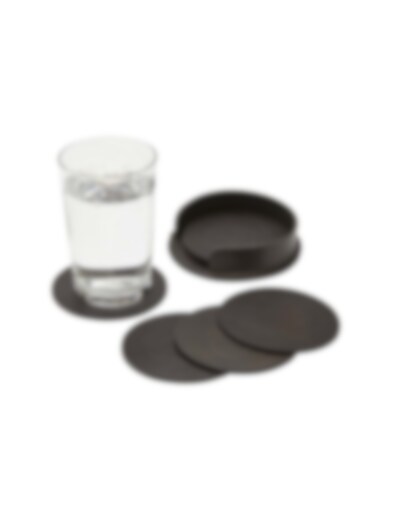 Seks rustikke svenskproduserte glassunderlag eller flaskeunderlag i kraftig skinn. Holder medfølger, også denne i skinn. Chevaliers logo preget på toppen av dalbanene og på baksiden et fint sitat som minner om vår arv om å alltid sette håndverk og kvalitet først